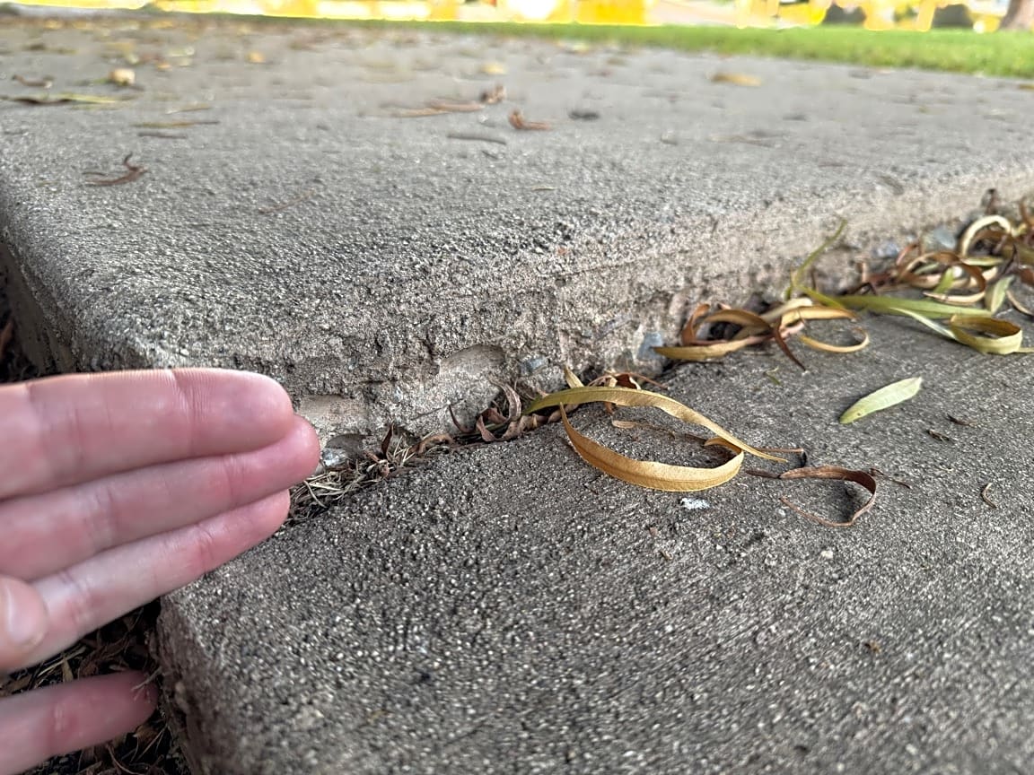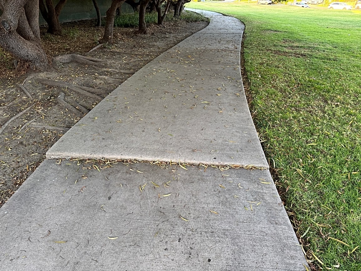 Two sections of pathway in the corner park are damaged. One popped up by roots, one sunken down from previous failed fix in another section. Very dangerous as there are zero lights in park at night.